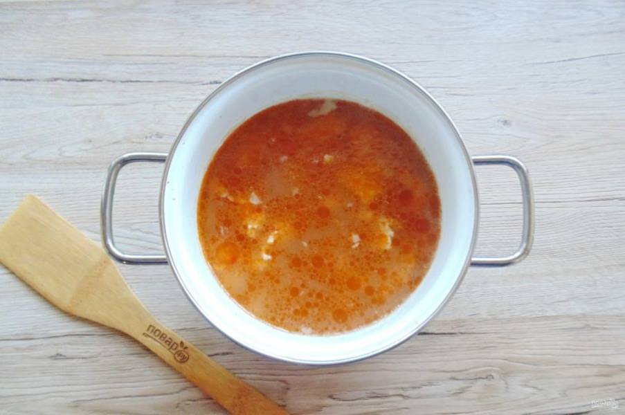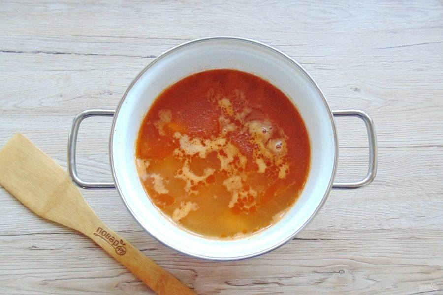 Добавьте в суп томатную пасту, перемешайте, посолите и поперчите.