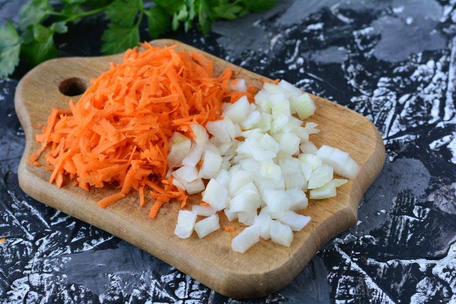 Тем времени почистите овощи — морковь и лук. Нарежьте лук кубиками, а морковь натрите на терке.
