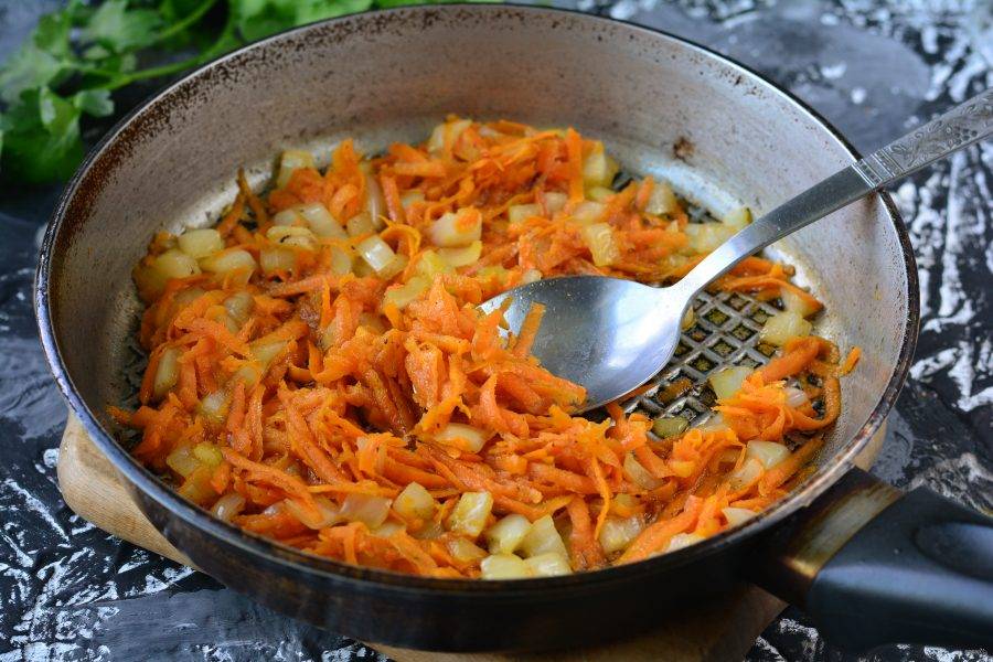 Обжарьте морковку с луком в сковороде с маслом. Жарьте 3-4 минуты, помешивая.