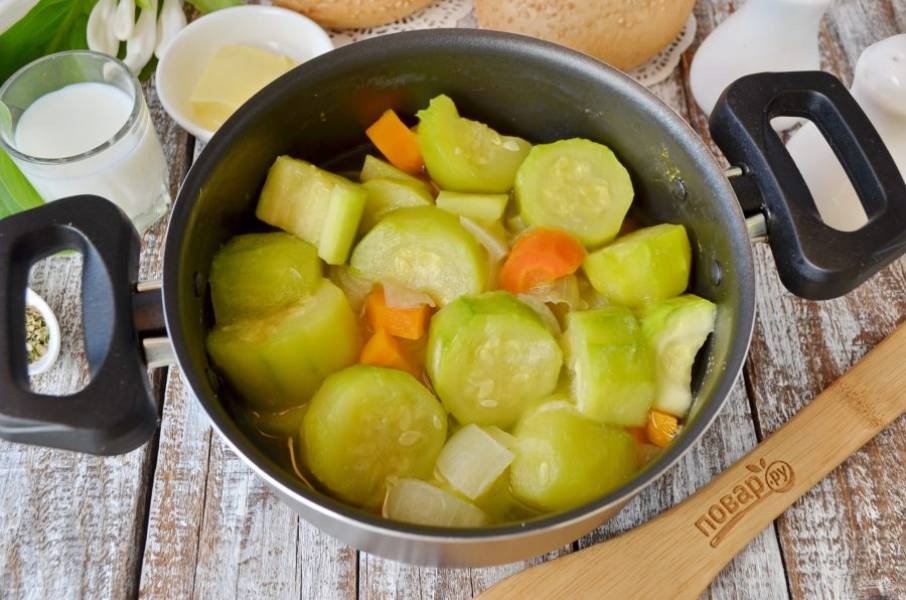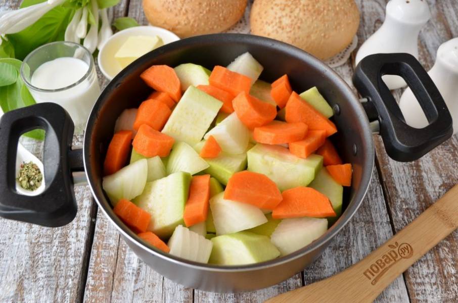 Порежьте крупно кабачок и лук, а морковь немного меньше, чтобы овощи одновременно сварились. Сложите их в кастрюлю, посолите немного, залейте водой так, чтобы она почти покрывала овощи.