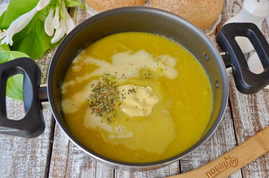 Горячие овощи пюрируйте погружным блендером, вливайте овощной бульон, регулируйте им густоту супа. Добавьте сливочное масло, сливки, прованские травы, черный перец и откорректируйте суп по соли.