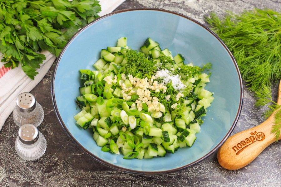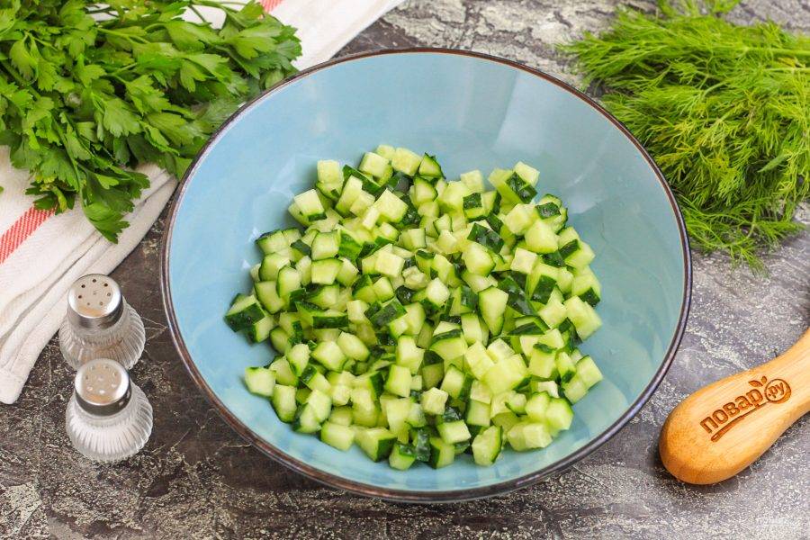 Промойте огурцы и срежьте с них хвостики. Нарежьте мелким кубиком и высыпьте в глубокую тарелку.