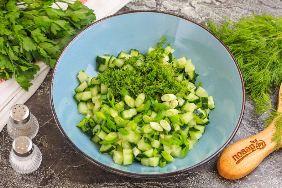 Промойте и измельчите зеленый лук и укроп, добавьте в емкость. По желанию можно использовать и другую свежую зелень.