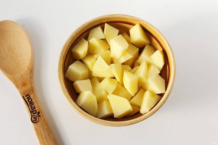 Картофель нарежьте кубиками и тоже отправьте в кастрюлю.