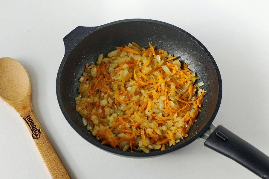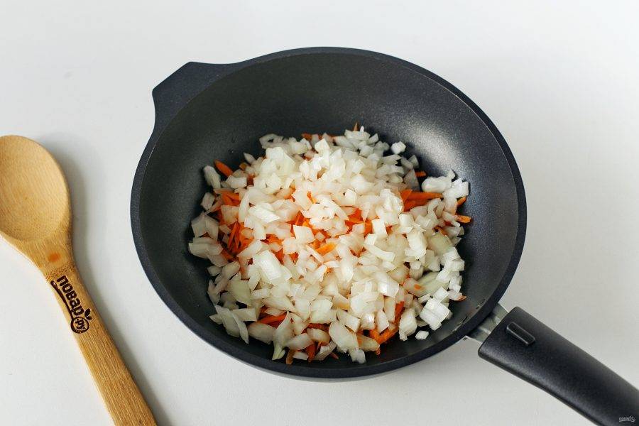 Лук нарежьте кубиками, а морковь натрите на терке.