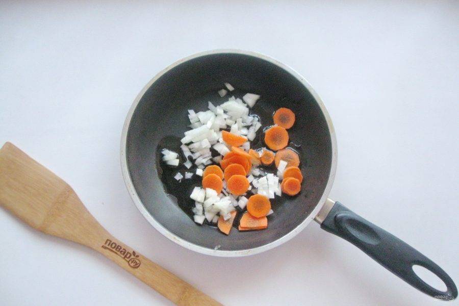 Морковь и лук нарежьте, выложите в сковороду с рафинированным подсолнечным маслом. Припустите овощи на среднем огне в течение 7-8 минут.