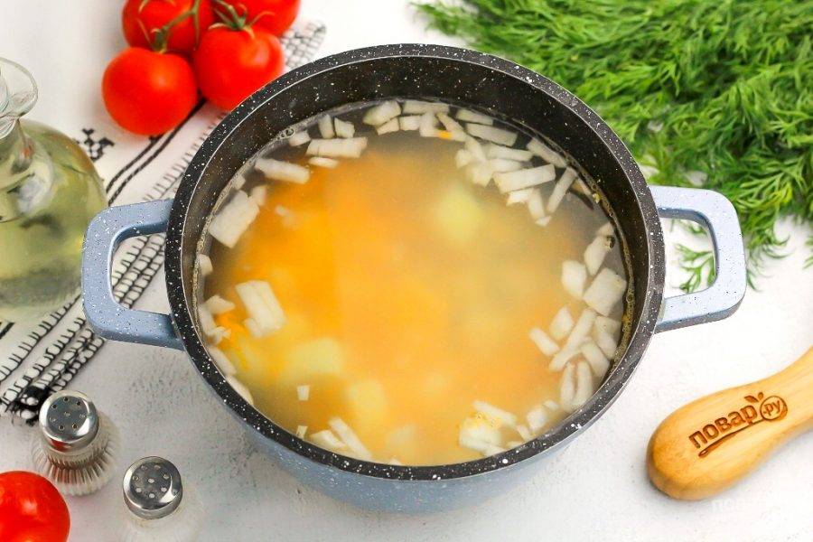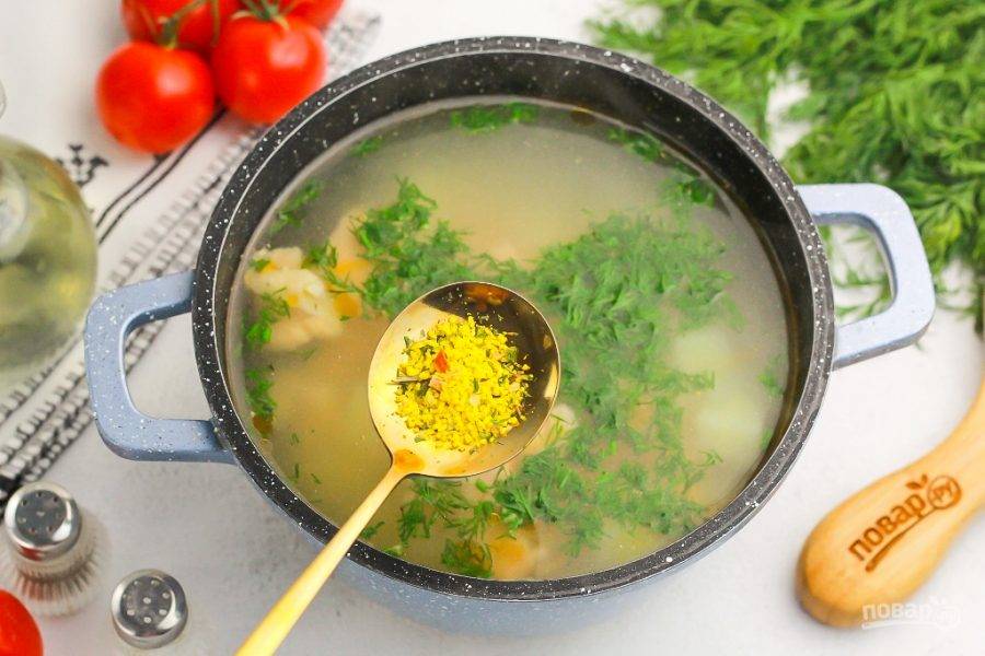 Добавьте приправу, специи по вашему вкусу, перемешайте и проварите суп 1 минуту. Выключите нагрев и накройте емкость крышкой. Дайте горячему пропариться без нагрева в течение 5-10 минут. За это время бульон насытится ароматами и вкусами всех ингредиентов.