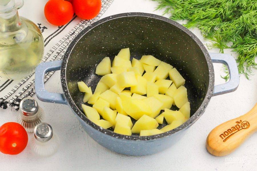 Картофель нарежьте средними или мелкими кубиками и высыпьте в казан, кастрюлю. Залейте кипятком и отварите примерно 10 минут. Так как картофель более жесткий по структуре, то сначала отваривайте его нарезку.