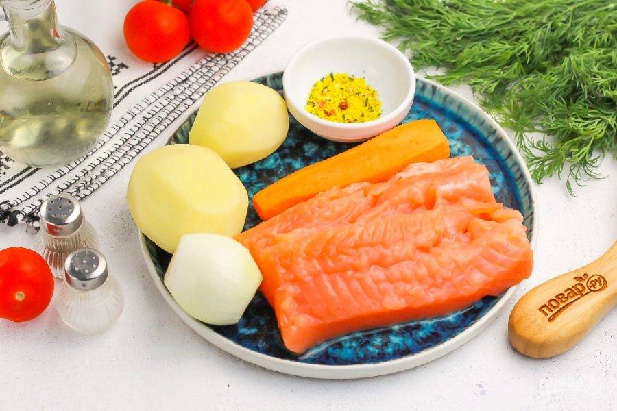 Подготовьте указанные продукты. Используйте любую охлажденную красную рыбу: семгу, форель, кету и т.д. По желанию суп варится из супового набора или из филе, или из головы и т.д. Овощи очистите от кожуры и промойте в воде.