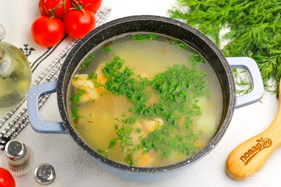 Промойте укроп и измельчите, добавьте в кипящий бульон. Вместо укропа допустимо использовать петрушку, сельдерей, любую другую пряную зелень, подчеркивающую вкус красной рыбы.