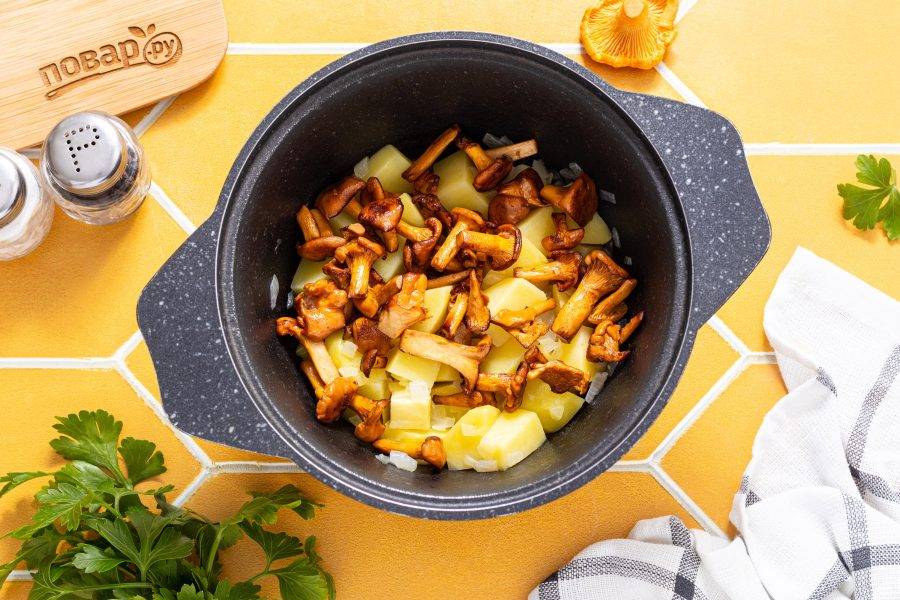 Влейте воду и доведите до кипения на сильном огне, затем убавьте температуру. Посолите и поперчите. Варите суп 10-12 минут до мягкости картофеля.