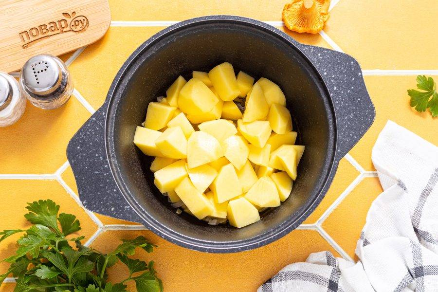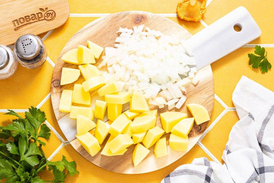 Картофель очистите, нарежьте кубиками среднего размера. Репчатый лук нарежьте на кубики поменьше.