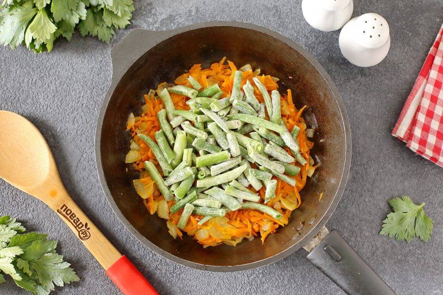 Добавьте стручковую фасоль и готовьте помешивая около 3 минут.