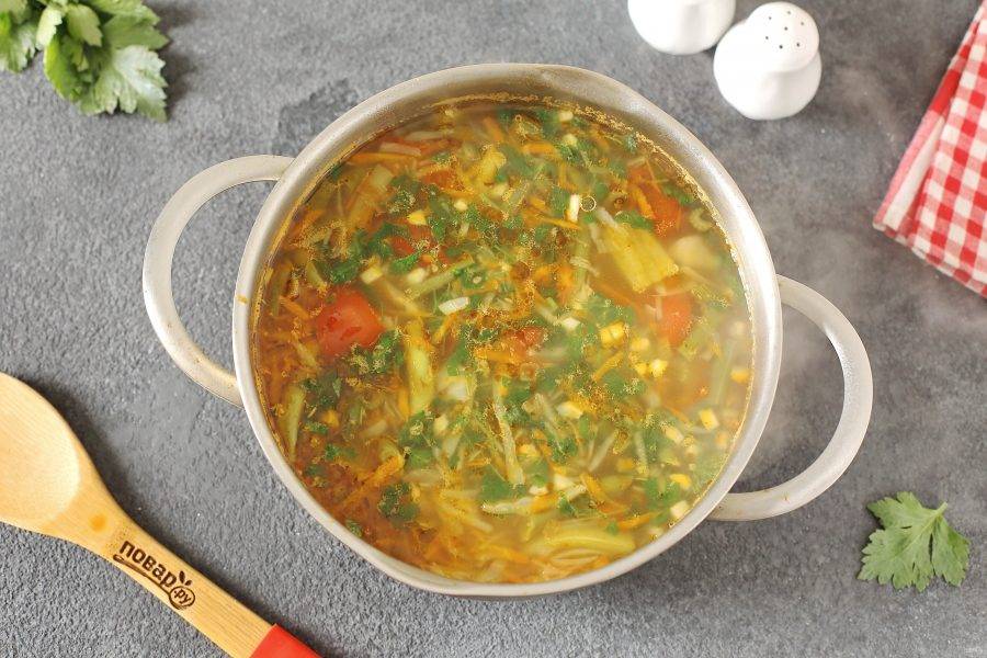В самом конце отрегулируйте на соль и добавьте измельчённый чеснок. Можно добавить любую свежую зелень.