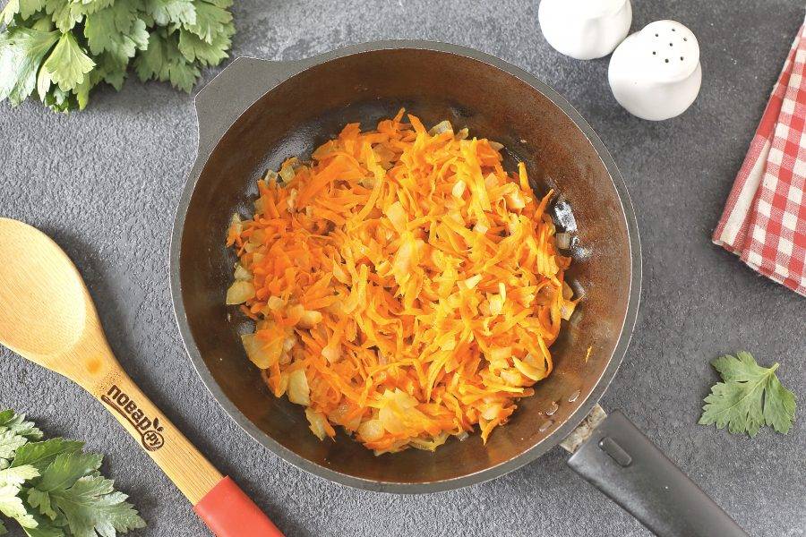 В сковороде обжарьте тёртую морковь и нарезанный кубиками лук.