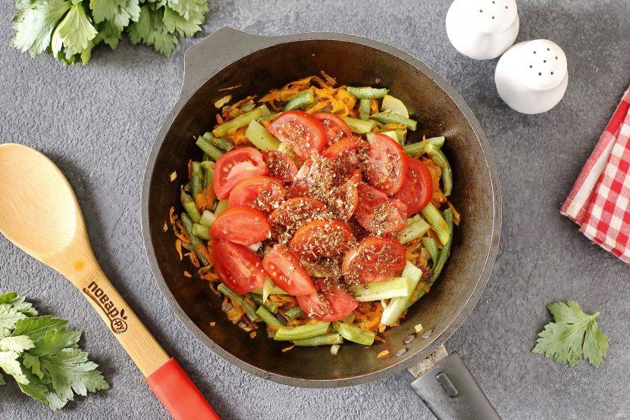 Затем добавьте нарезанные помидоры, соль и специи по вкусу.