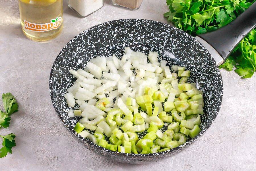 Очистите луковицу от шелухи, промойте в воде. Нарежьте мелкими кубиками. Промойте стеблевой сельдерей и нарежьте его мелкими кусочками. Отпассеруйте все в растительном масле на сковороде примерно 2-3 минуты.