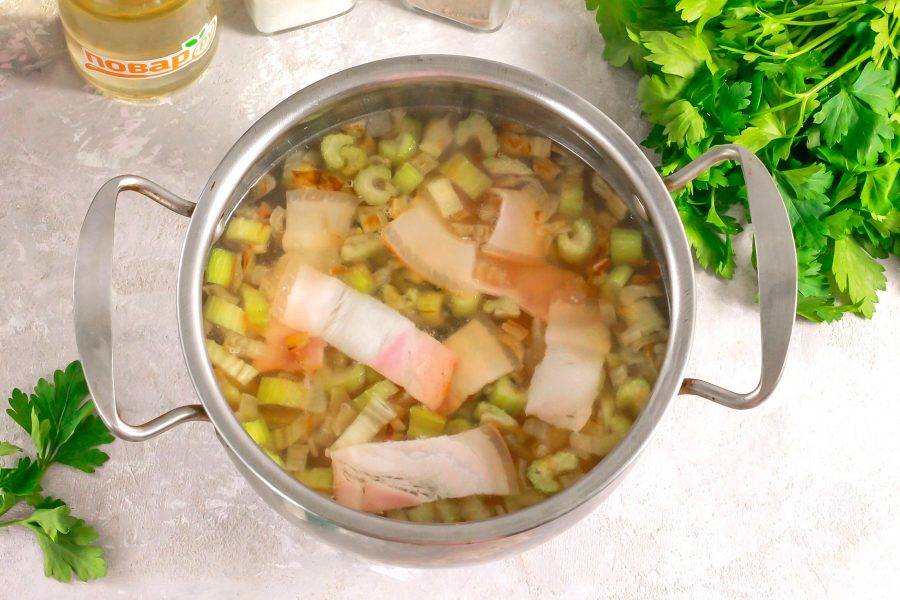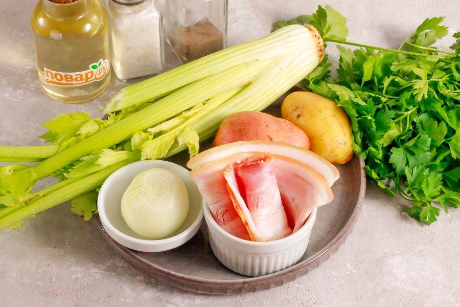 Ароматный и вкусный суп можно приготовить с сельдереем и беконом. Причем бекон допустимо использовать как соленый, так и копченый — блюдо получится наваристым и аппетитным.