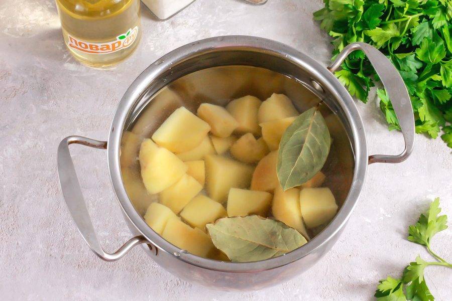 Картофель нарежьте средними кубиками и высыпьте в кастрюлю, казан. Добавьте лавровые листья и влейте теплую воду. Поместите емкость на плиту и отварите все примерно 15 минут.