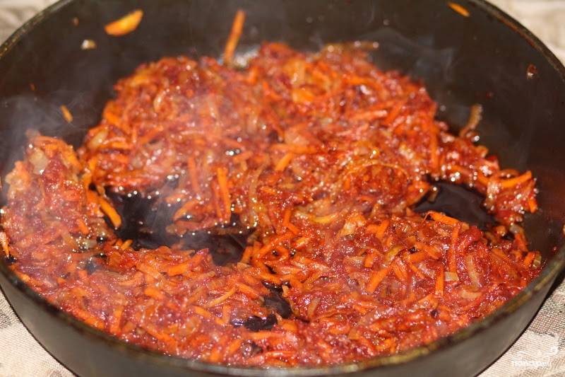 8. Затем добавляем к овощам мякоть помидоров или 2 ст. ложки томатной пасты. Перемешиваем все и продолжаем обжаривать в течение 5-6 минут.