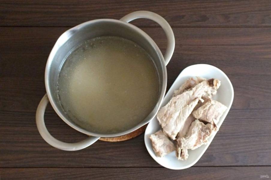 В 2 литрах воды отварите свиные ребрышки. Бульон процедите. С ребрышек снимите мясо. Нарежьте кусочками, отложите.