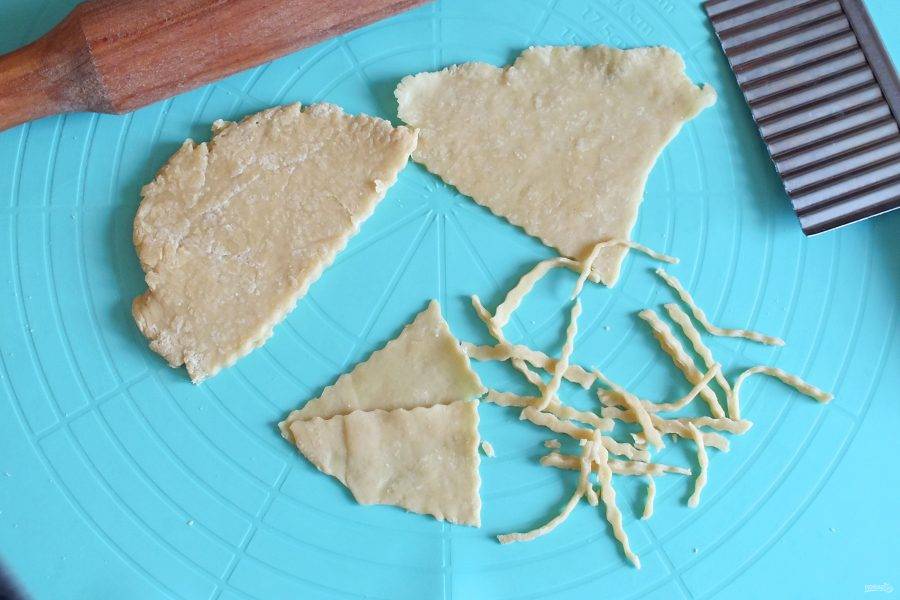Достаньте из холодильника тесто. Разделите его на 4 части. Из каждой раскатайте тонкие, почти прозрачные пласты. Нарежьте из них лапшу.