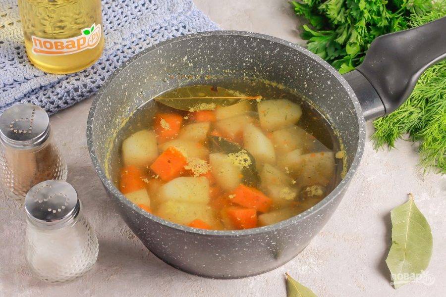 Нарежьте картофель и морковь крупными кусочками, и высыпьте нарезки в ковш или кастрюлю. Добавьте овощную приправу, лавровые листья и горячую воду. Отварите все примерно 20 минут.