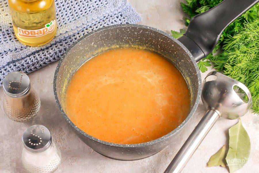 Из бульона удалите лавровые листья и отпюрируйте его, чтобы получить бархатистую консистенцию. По желанию можно добавить пару столовых ложек белого вина для вкуса.