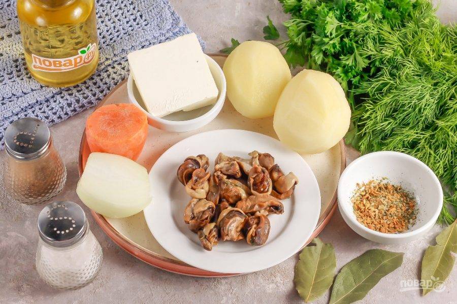 Подготовьте указанные ингредиенты. Очистите от кожуры картофель, лук и морковь, промойте овощи в воде.