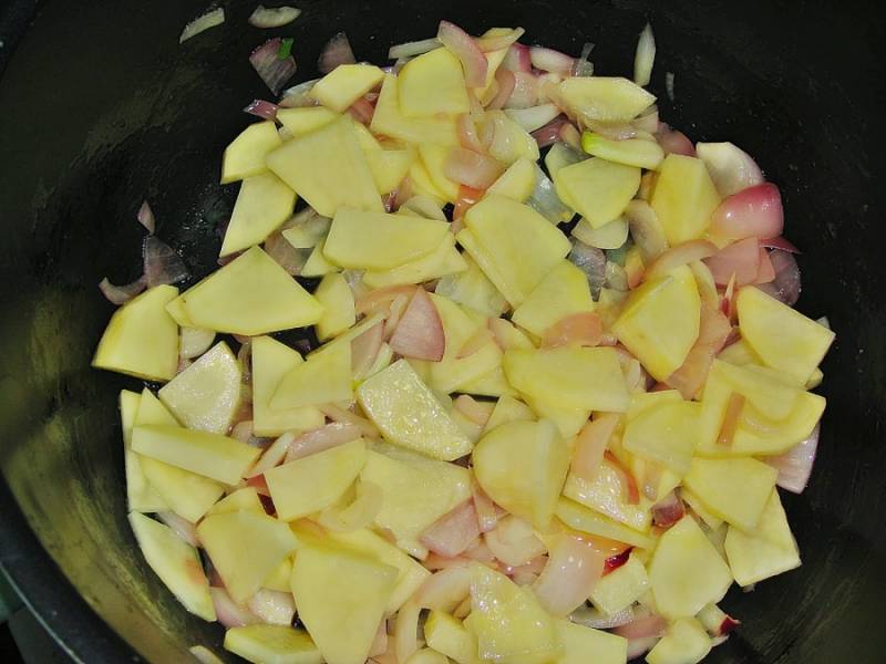 В кастрюле обжарить лук до прозрачного цвета, добавить порезанный картофель.