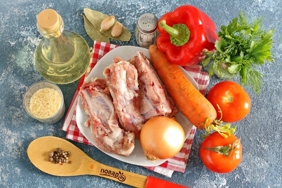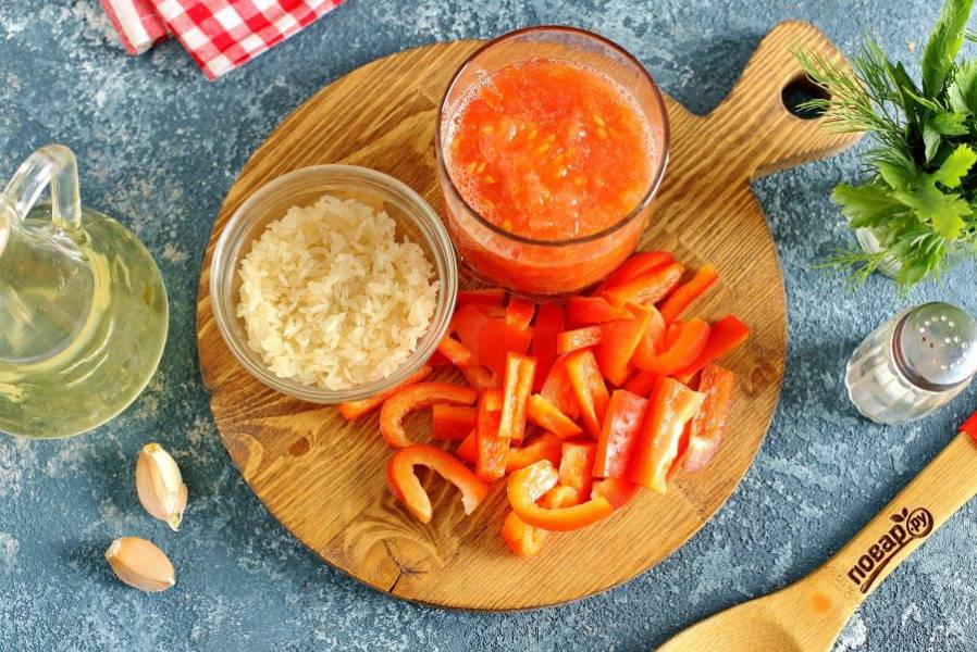 Помидоры разрежьте пополам и натрите на терке (шкурку можно убрать, нам понадобится только мякоть). Болгарский перец нарежьте кубиками или небольшой соломкой. Рис хорошо промойте.
