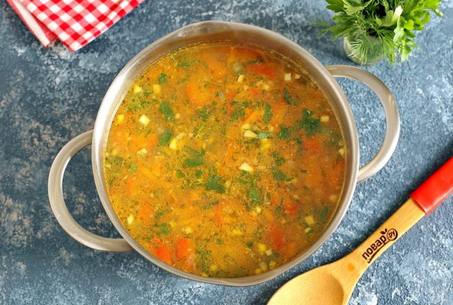 За минут 5-7 до готовности, добавьте овощную зажарку, мякоть томатов и болгарский перец. В самом конце добавьте измельченный ножом чеснок и рубленую зелень. Выключите огонь, накройте кастрюлю крышкой и дайте настояться 10-15 минут. Суп "Краснодарский" готов.
