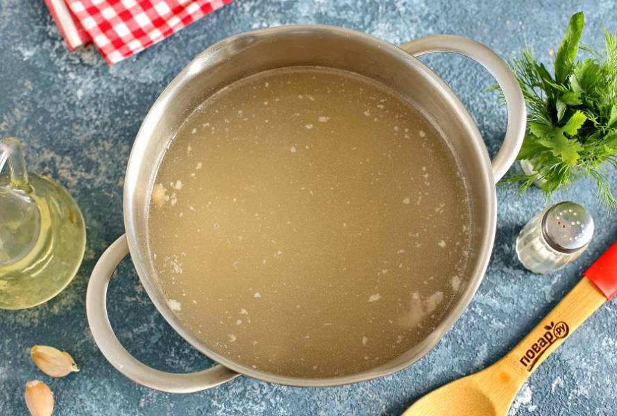 Мясо залейте водой, добавьте лавровый лист, перец горошком (можно любые специи по вкусу) и поставьте вариться мясной бульон. Не забудьте после закипания снять пену.