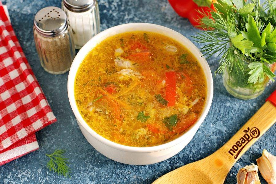 Простой в приготовлении и очень вкусный супчик, который понравится всем. Суп готовится на мясном бульоне со сладким перцем, помидорами, рисом и чесноком. Попробуйте!
