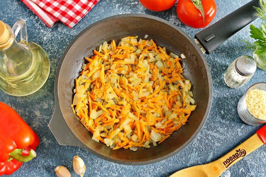 Пока готовится бульон, подготовьте остальные ингредиенты. Лук и морковь обжарьте до мягкости на растительном масле. Нарезка может быть любая.