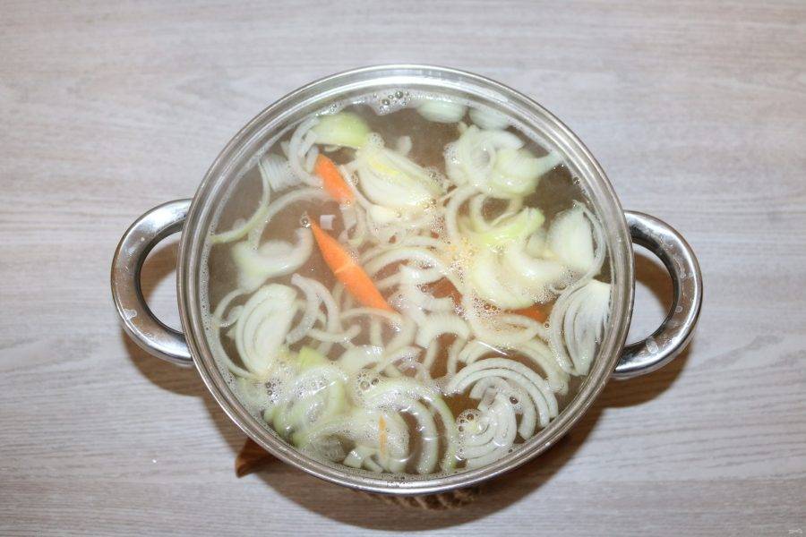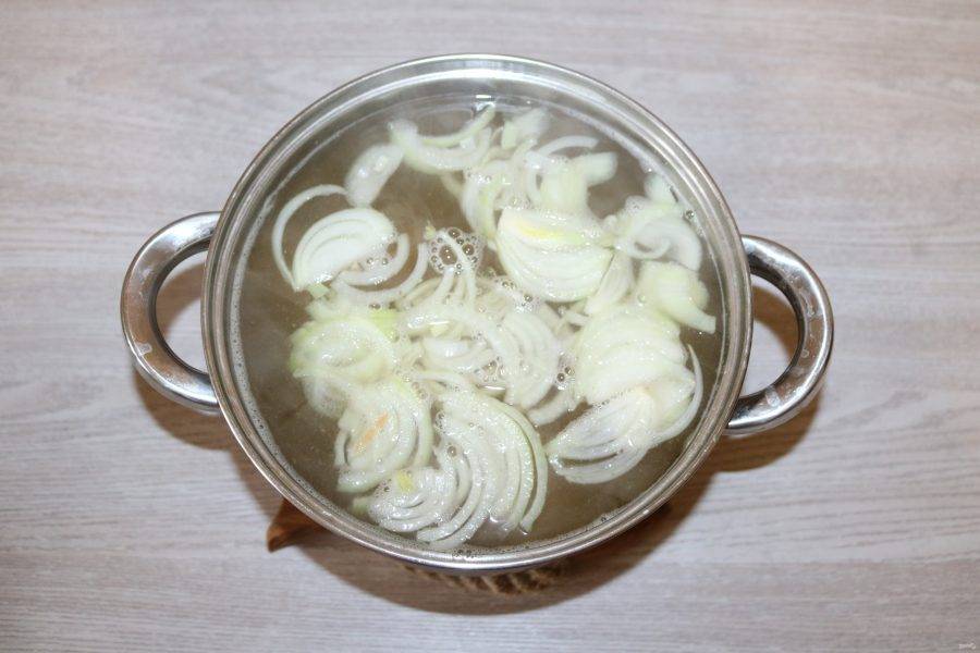 Бульон посолите. Лук нарежьте полукольцами, добавьте в бульон.