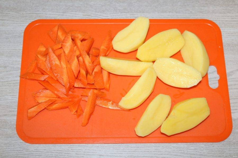 Картофель нарежьте пополам, морковь крупной соломкой.
