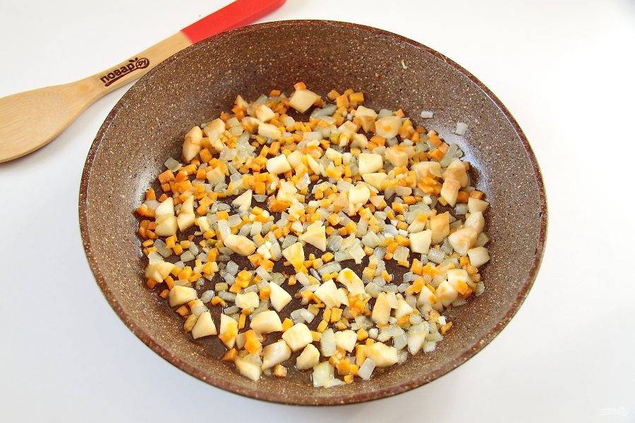 3. Растопите на сковороде сливочное масло и обжарьте до мягкости лук с морковью. Затем добавьте яблоко и готовьте все вместе еще пару минут.
