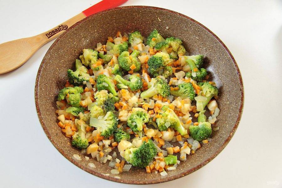4. Добавьте брокколи, разделанную на соцветия и продолжайте обжаривать еще 3-5 минут.