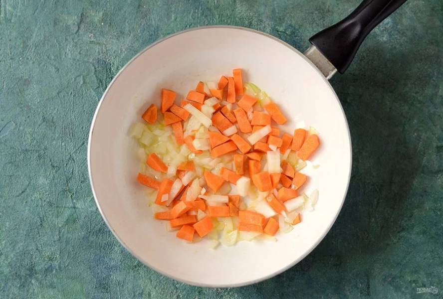 Морковь и лук очистите, нарежьте кубиками. Обжаривайте в сковороде с маслом примерно 10 минут до золотистого цвета.
