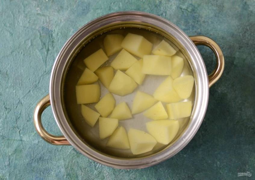 Картофель помойте, очистите, нарежьте кубиками. Переложите в кастрюлю с водой, поставьте на средний огонь.