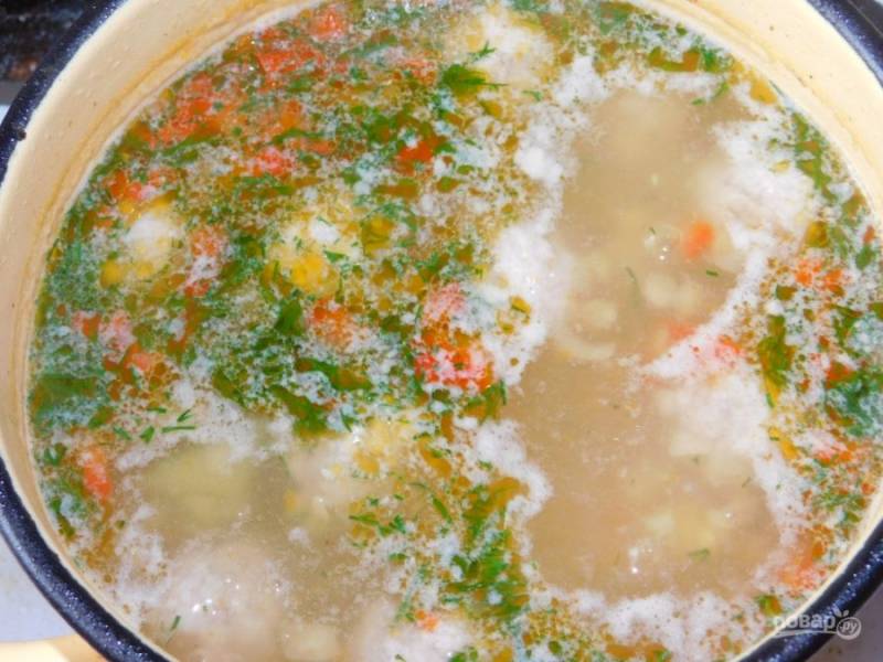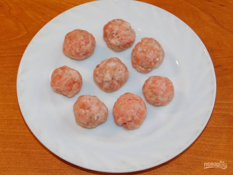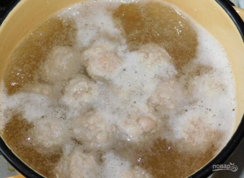 Воду доведите до кипения и опустите туда фрикадельки. Доведите до кипения, снимая образовывающуюся пенку.