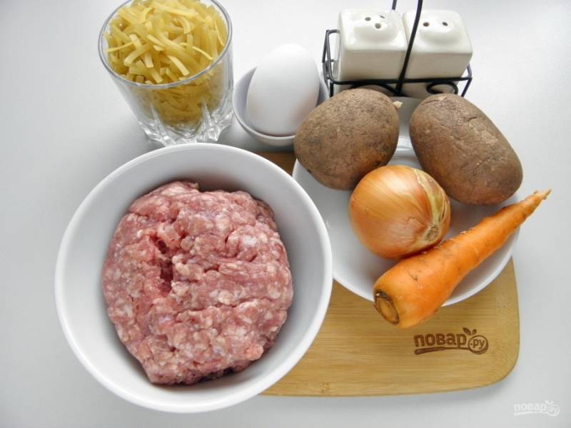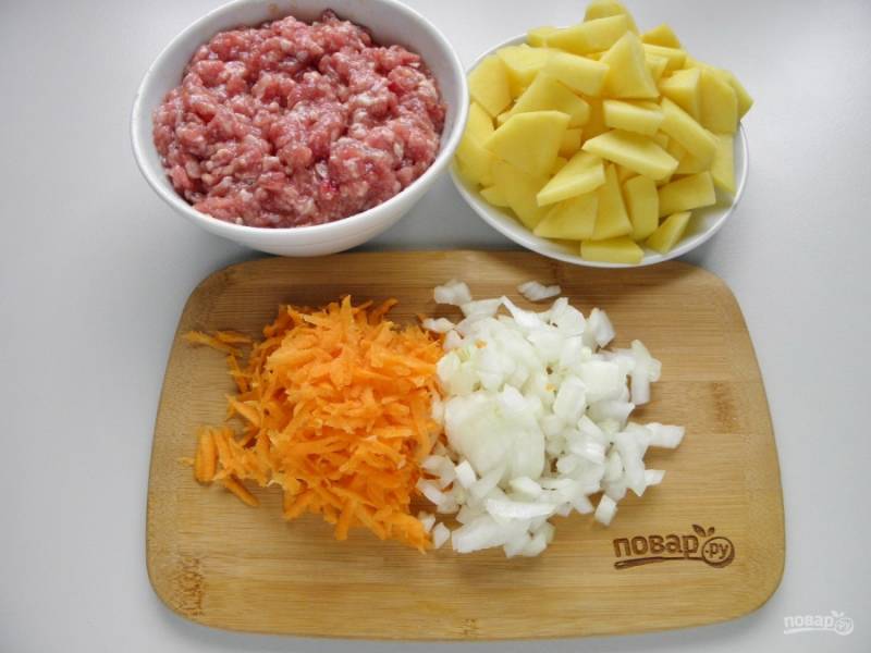 Очистите овощи. Картофель и лук порежьте, морковь натрите на терке.