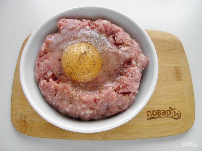 В фарш добавьте соль, перец черный молотый и сырое яйцо. Перемешайте хорошенько.
