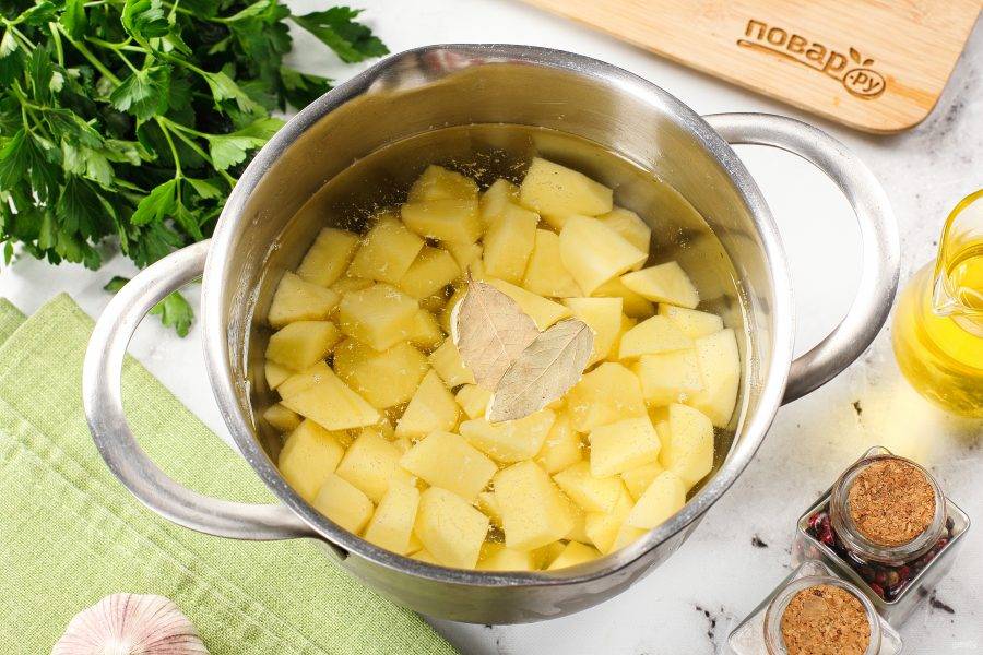 Картофель нарежьте небольшими кубиками или брусочками, как вам больше нравится. В кастрюлю с водой или бульоном отправьте нарезанный картофель и лавровый лист. Доведите всё до кипения, далее пламя убавьте и варите картошку под крышкой до готовности.