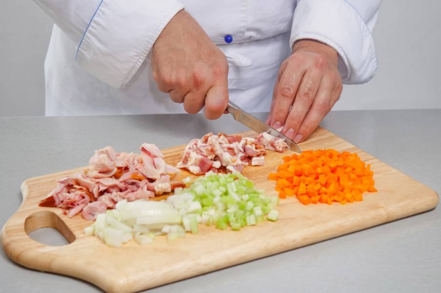 Горох замочить на 2 ч. Мясо курицы отделить от костей и нарезать крупными кусками, бекон – небольшими кубиками. Лук и морковь очистить и мелко нарезать. Сельдерей вымыть и измельчить.