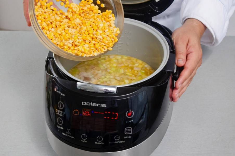 В суп добавить горох, довести до кипения, уменьшить температуру до 120°С и варить 30 мин.