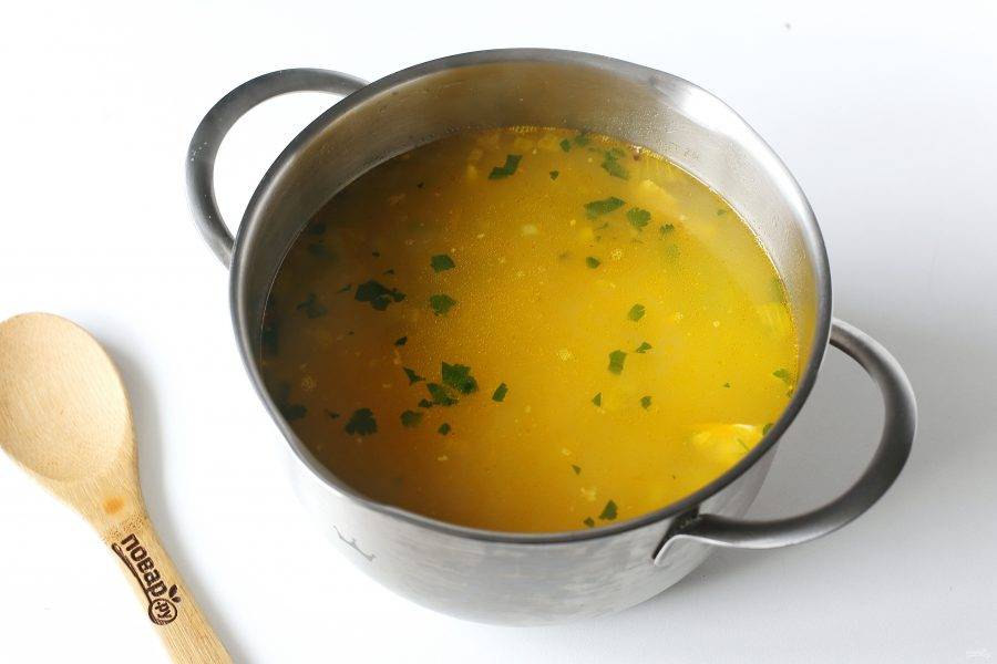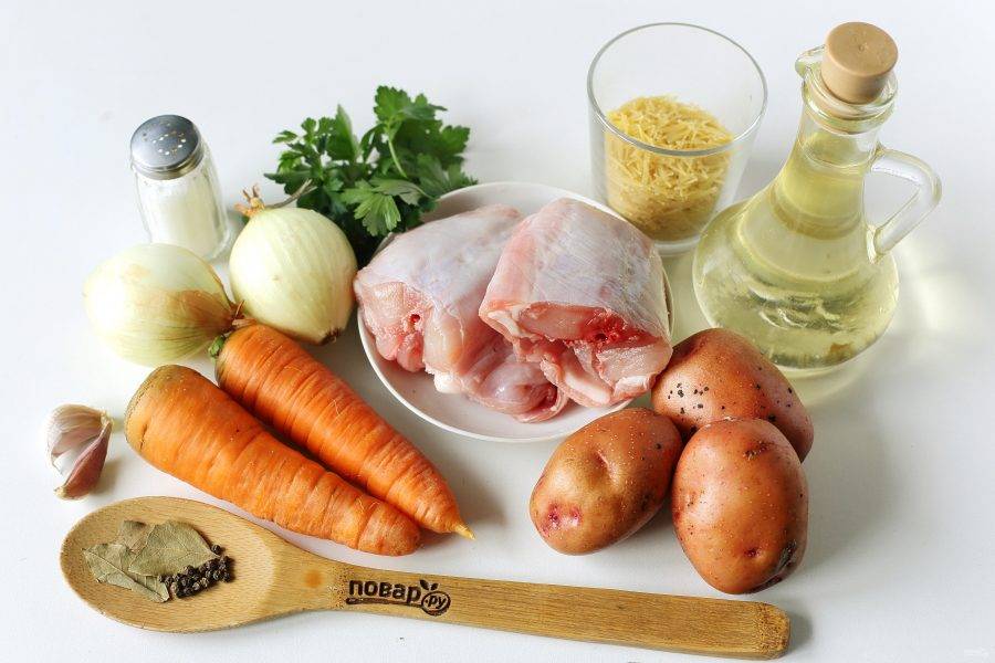 Готовый бульон процедите, мясо отделите от костей и верните в кастрюлю. Добавьте овощи и готовьте до полной готовности картофеля. В самом конце добавьте вермишель, зелень и измельченный чеснок.