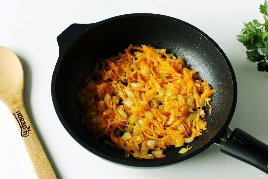 Пока готовится бульон, обжарьте в сковороде лук и морковь.
