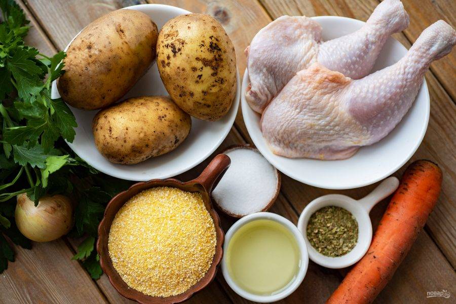 Этот суп получается очень сытным и вкусным! Идеальный вариант блюда для семейной трапезы. По консистенции суп достаточно густой из-за добавления кукурузной крупы в состав ингредиентов.